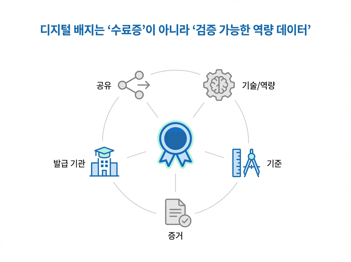 요약: 디지털 배지는 수료증이 아닙니다. 역량·평가·근거를 재사용 가능한 데이터로 남기는 장치입니다.