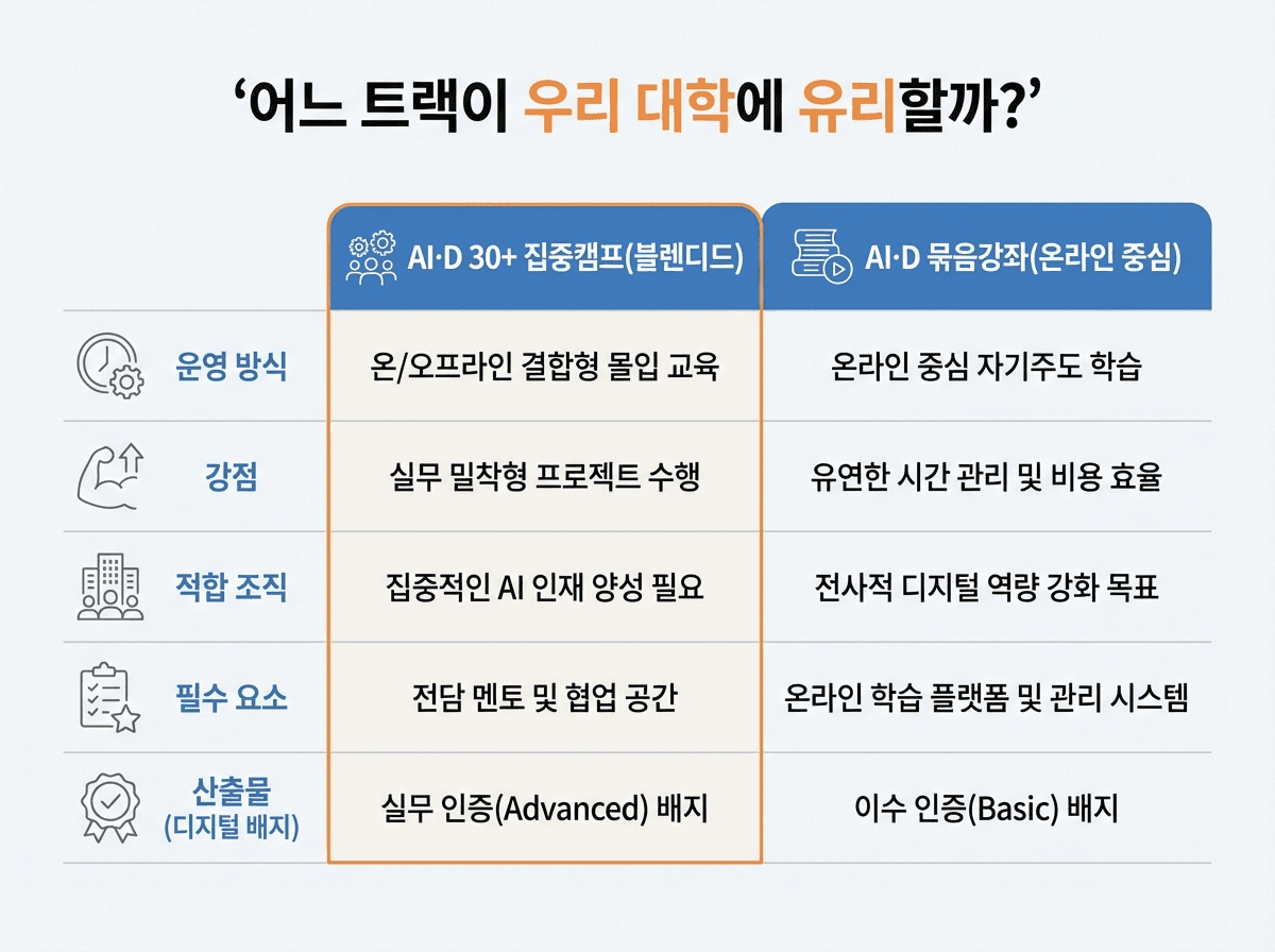 이 트랙이 유리한 기관: 원격·온라인 강의 제작 역량이 이미 확보된 대학, 기존 강좌 자산을 묶음 구조와 인증으로 재설계할 수 있는 조직