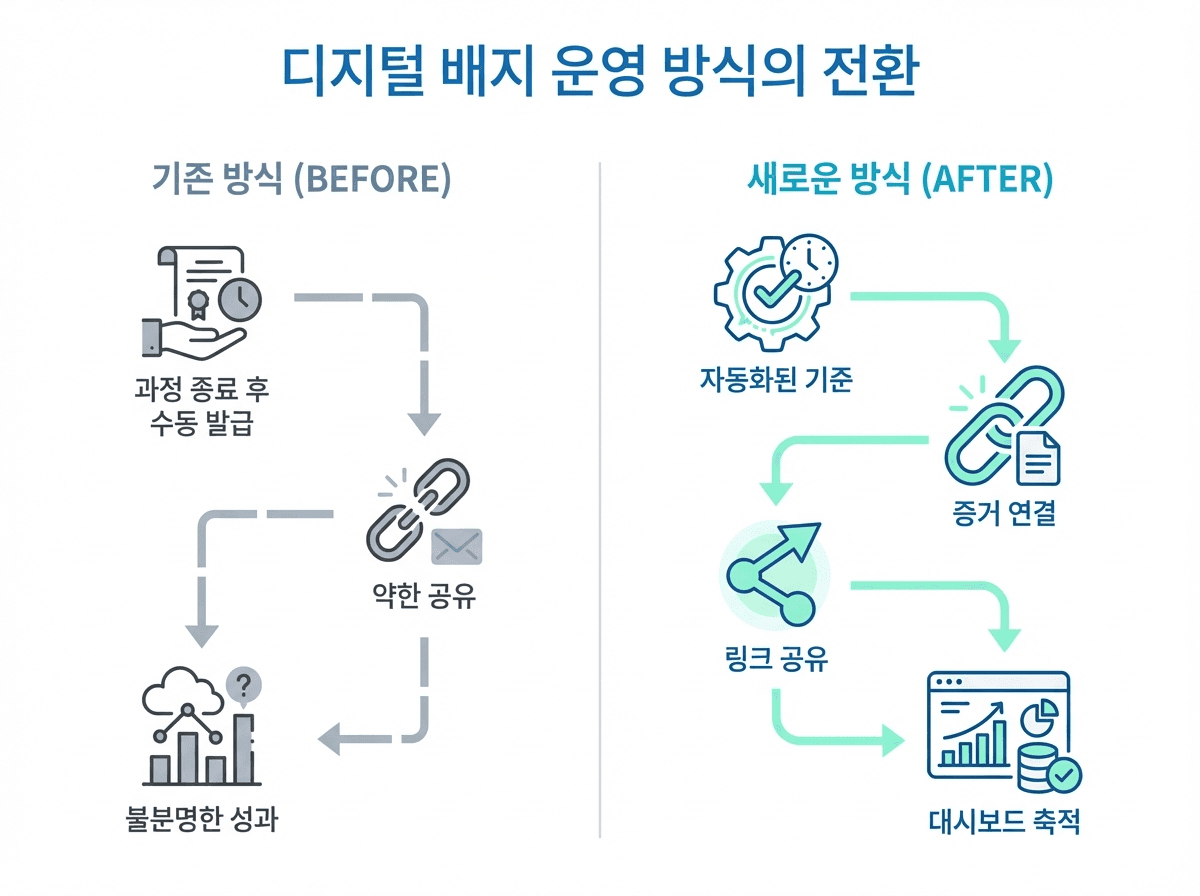 디지털 배지를 "사후 발급 업무"로 두면 운영 부담만 커집니다. 처음부터 과정 설계의 일부로 넣어야 성과가 달라집니다.
