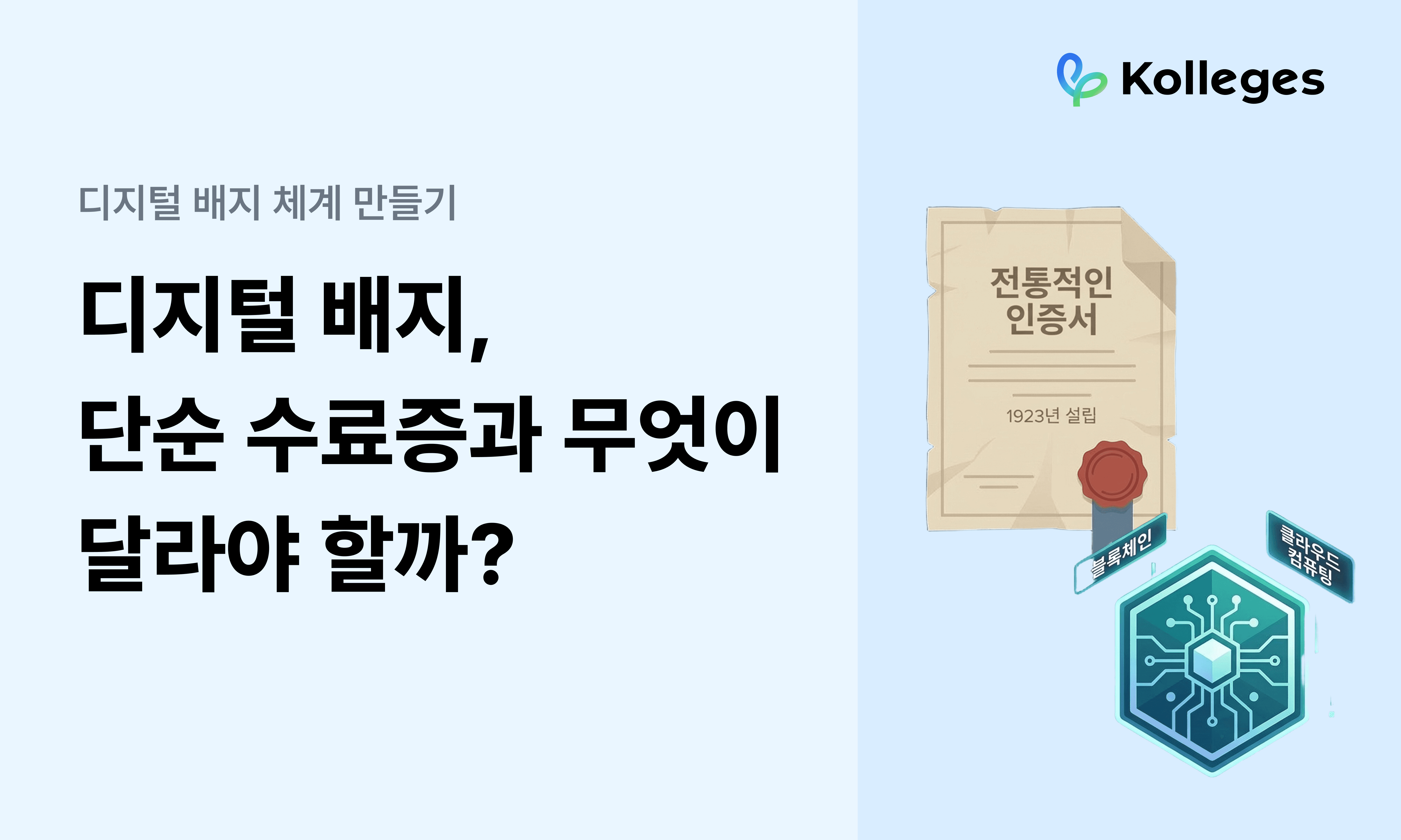디지털배지 도입을 검토하는 대학에서 가장 자주 듣는 질문은 이것입니다. '기존 수료증을 디지털로 전환하면 되는 것 아닌가요?' 겉으로 보면 맞는 말처럼 보입니다. 둘 다 무언가를 완료했다는 표시이니까요. 하지만 바로 이 지점에서 방향이 갈립니다.