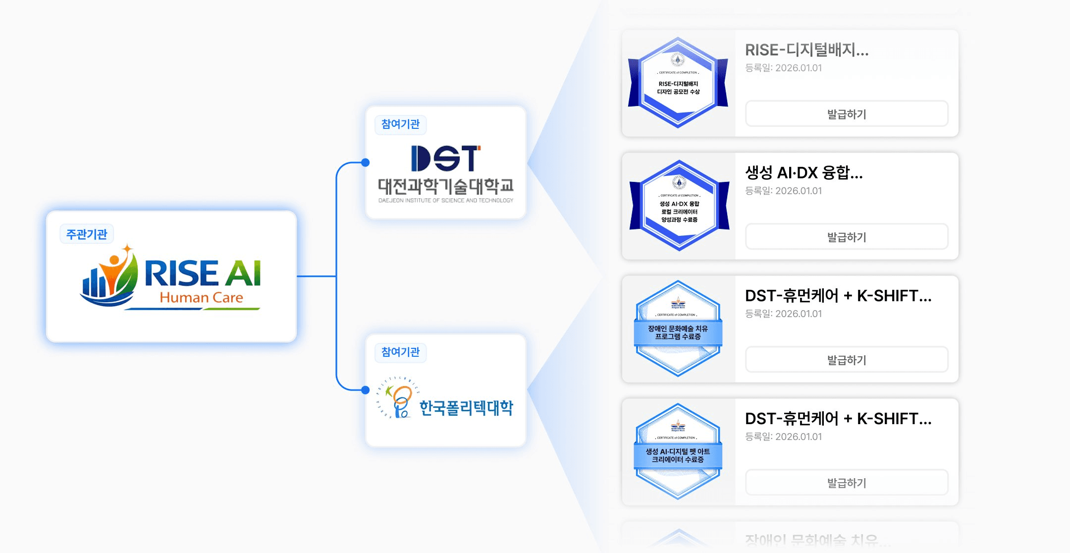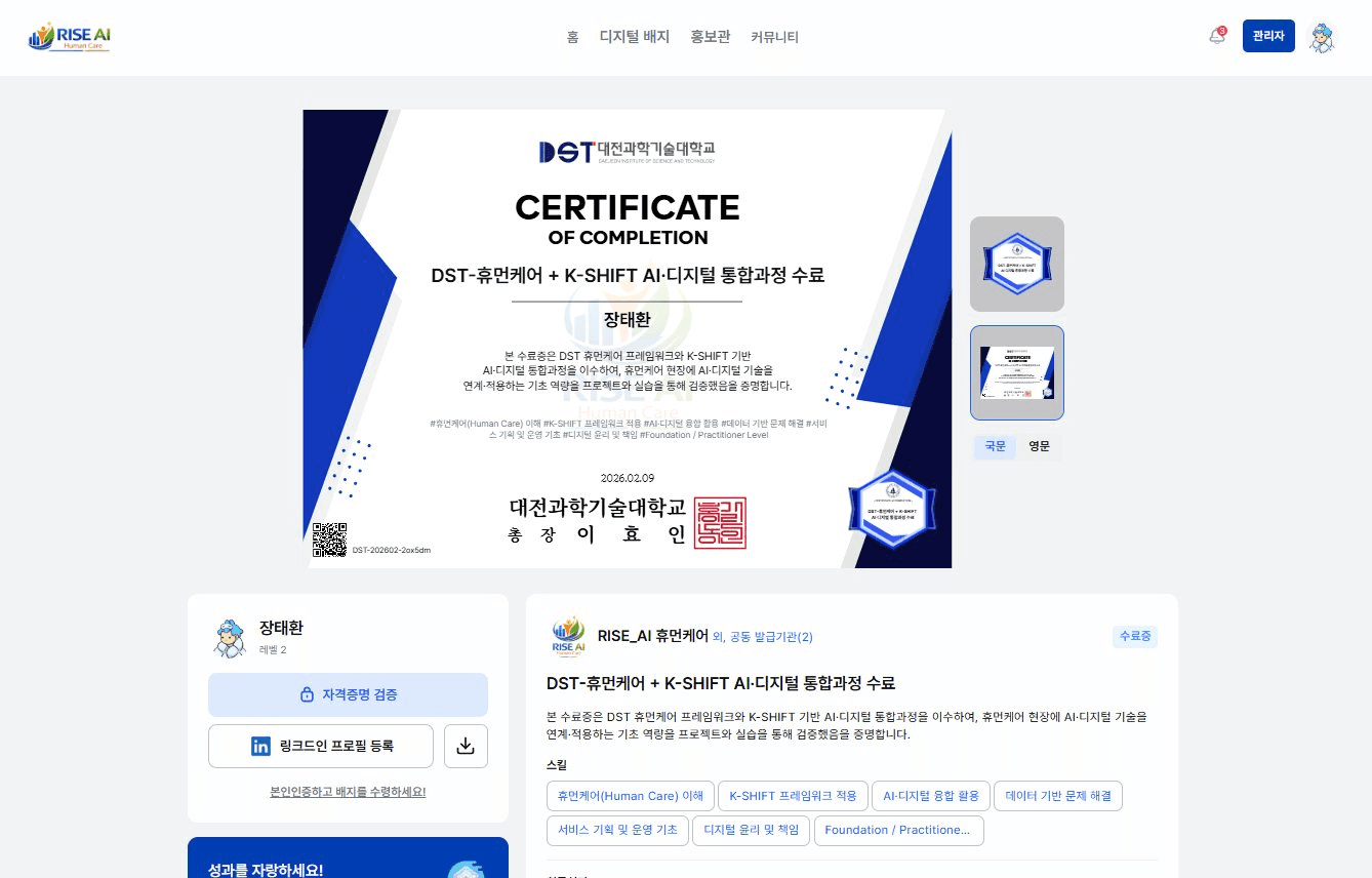 한국폴리텍대학 대전캠퍼스와 대전과학기술대학교는 ‘DST-휴먼케어 + K-SHIFT AI·디지털 통합과정’을 핵심 축으로, AI 기술 구현부터 예술 매개 치유, 맞춤형 상담, 리빙랩 실증까지 단계별 역량을 정의했습니다. 각 단계가 끝날 때마다 두 기관 로고가 함께 들어간 공동 인증 배지가 발급되어, 학생 한 명의 학습 경험 위에 두 대학의 인증이 함께 쌓이는 구조입니다.