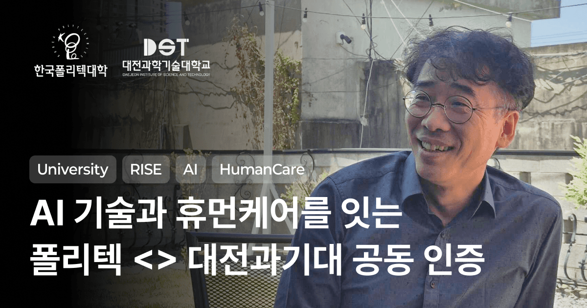 기술대학과 보건대학은 보통 같은 강의실에 서지 않습니다. 한국폴리텍대학 대전캠퍼스 인공지능과는 RISE(지역혁신중심 대학지원체계) 사업을 계기로, 보건·복지 인프라를 가진 대전과학기술대학교와 ‘AI 휴먼케어’ 컨소시엄을 꾸렸습니다. 두 대학은 청년창업지원공간 ‘가양노드’를 시작점으로 수요발굴·기술개발·현장 실증·인재 정착의 단계를 함께 설계하고, 교육 이수 결과를 종이 수료증이 아니라 두 기관 로고가 함께 들어간 디지털배지로 발급합니다. 지역창업과 RISE 방향성을 책임지는 김대곤 교수, 인공지능과 교육 실무를 이끄는 한익섭 교수와 함께한 인터뷰를 정리했습니다.