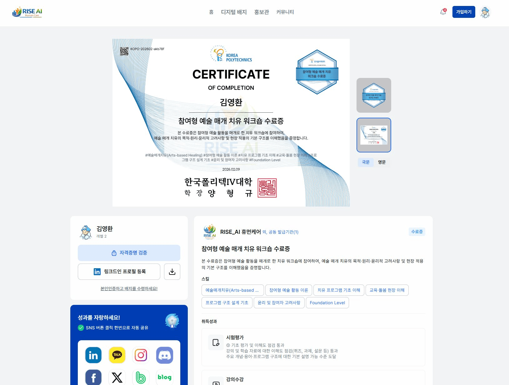 학생 반응에서 인상 깊었던 것은 ‘배지 디자인 공모전’입니다. 기관이 일방적으로 발급하는 인증서가 아니라, 학습자 본인이 디자인 과정에 참여한 인증서. 이 경험이 디지털배지를 ‘남이 준 종이’가 아니라 ‘내가 만든 자산’으로 받아들이게 만든다고 합니다. 모바일로 즉시 증명할 수 있다는 점은 취업 준비, 면접 같은 일상 장면에서 곧장 효용으로 이어집니다.