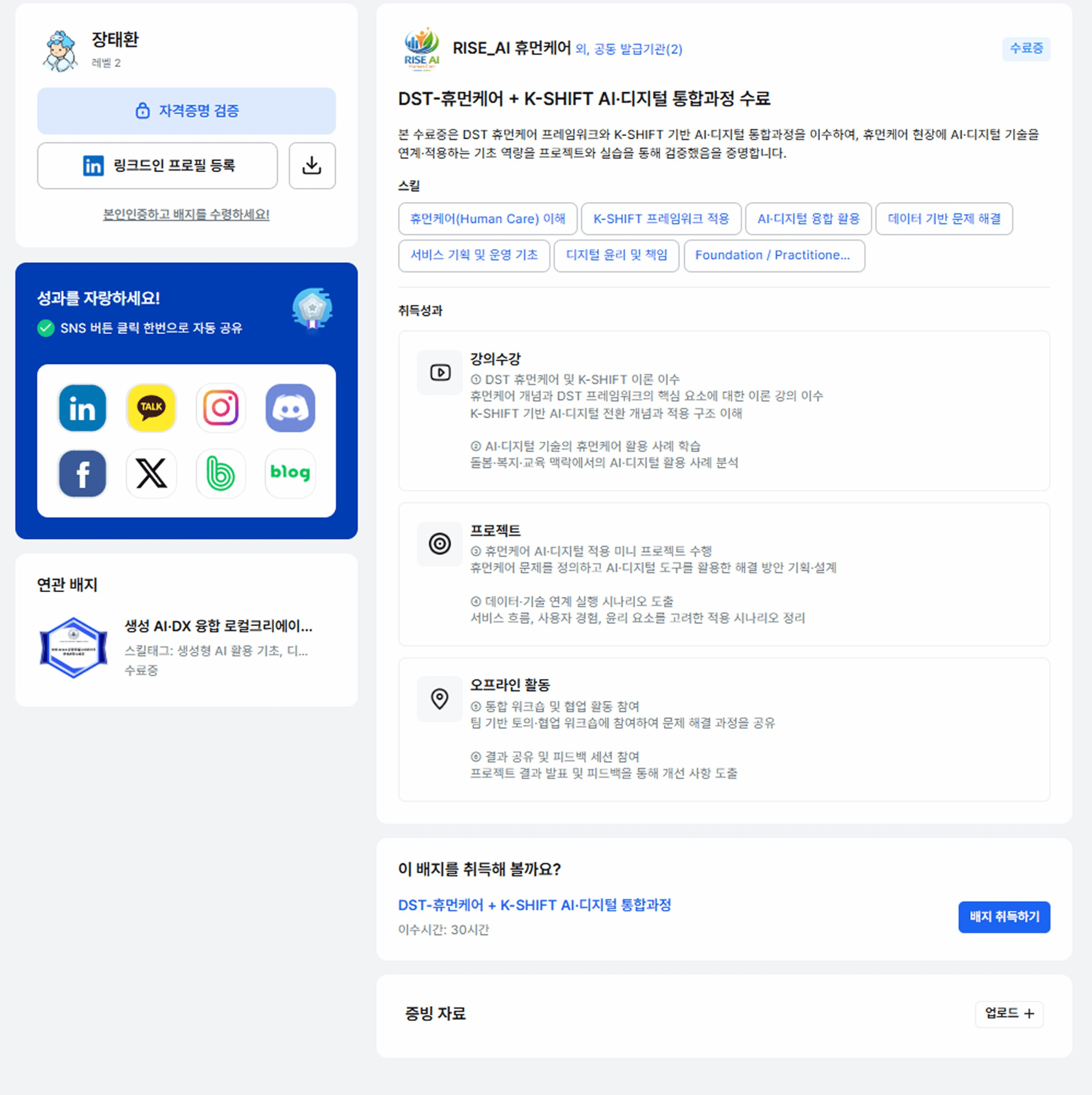 한 교수가 운영하는 인공지능과의 강의실은 그 한계를 가장 먼저 체감하는 자리이기도 합니다. 인문계 졸업 비전공자, 자동화 필요성을 느낀 경력자, 디지털 전환의 한계를 마주한 보건·복지 현직자, 커리어 전환 희망자가 한 교실에 들어옵니다. 출발점이 다른 학습자에게는 단일 코스가 아니라 단계별 확장형 커리큘럼이 필수가 됩니다. 이 구조가 그대로 디지털배지의 ‘단계별 인증’과 맞물립니다.