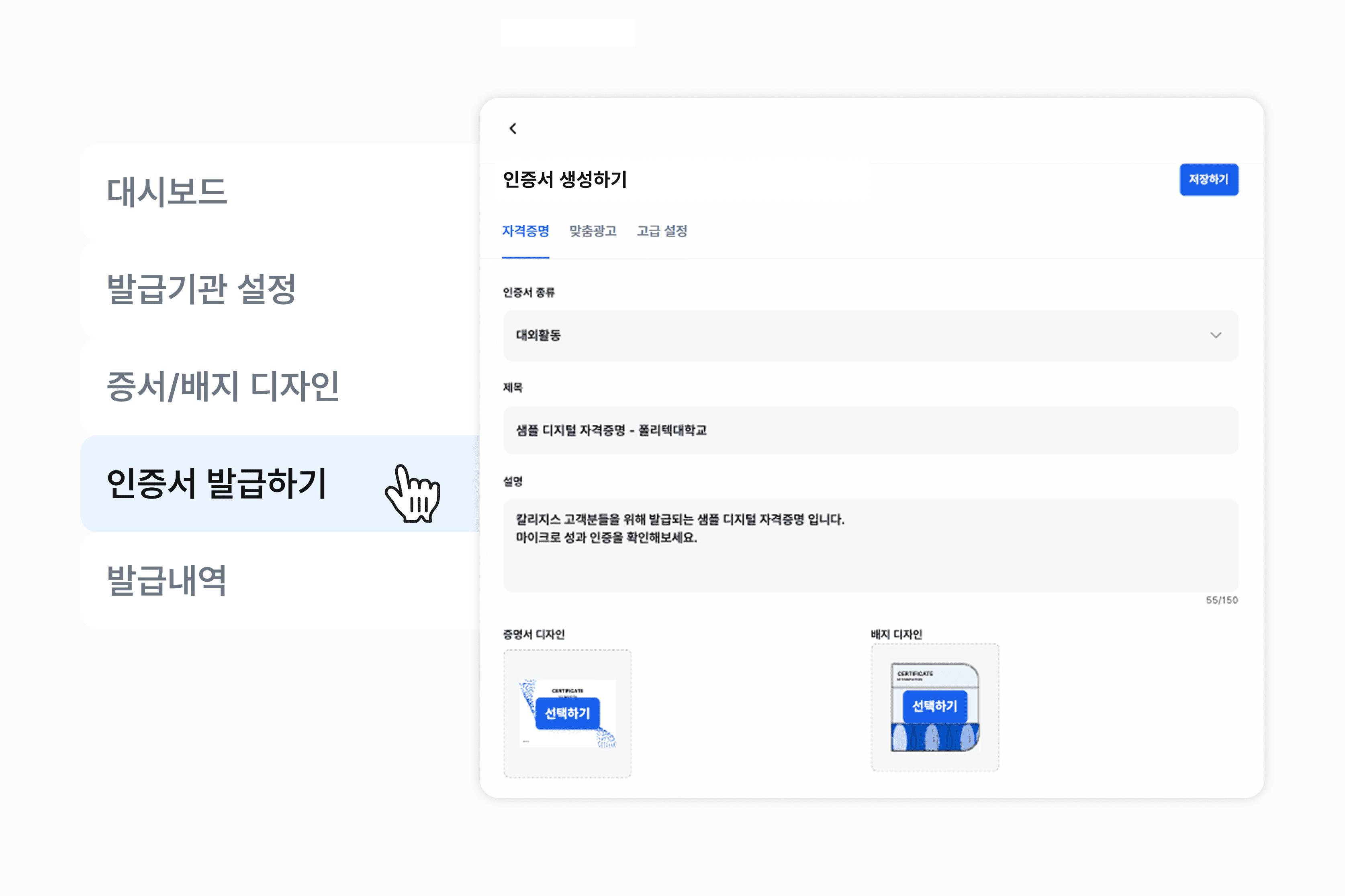왼쪽 사이드 메뉴에서 [디지털배지(인증서)] > [인증서 발급하기] 메뉴를 클릭하여 [디지털배지(인증서) 관리] 페이지로 이동합니다.