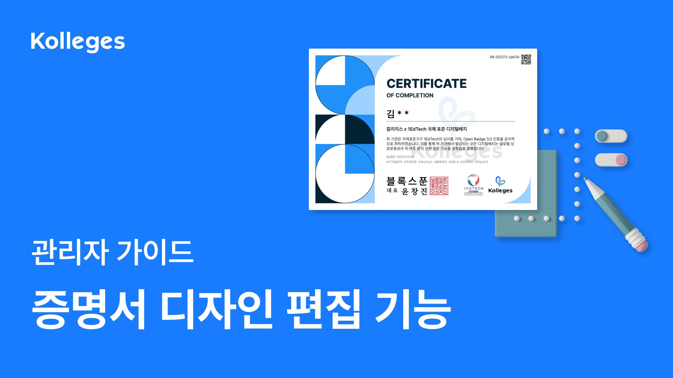 수료증 디자인 설정 가이드. 칼리지스에서 디지털 배지와 연계된 맞춤형 인증서를 만드세요.
