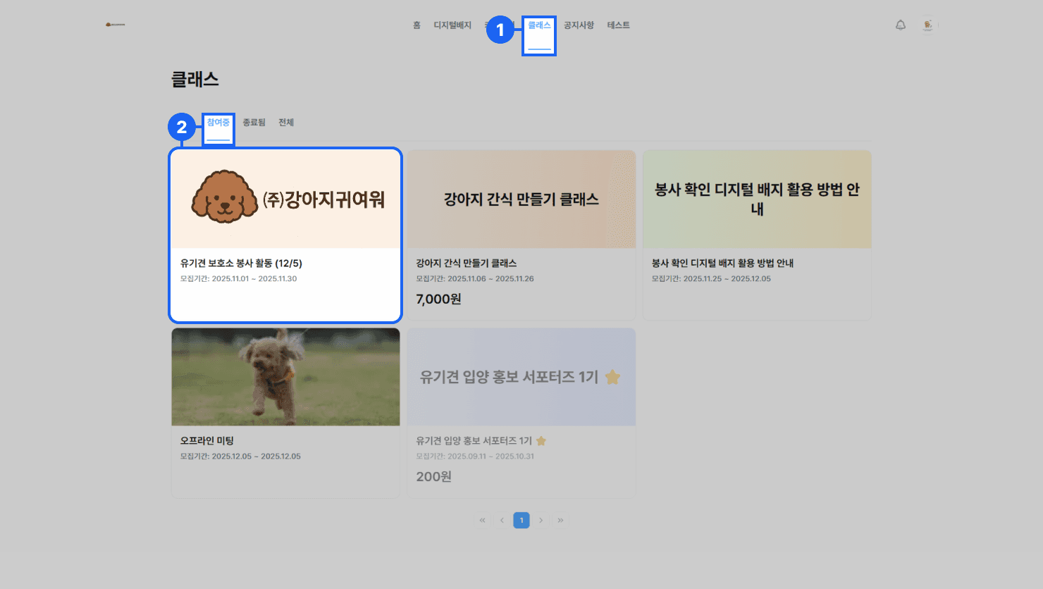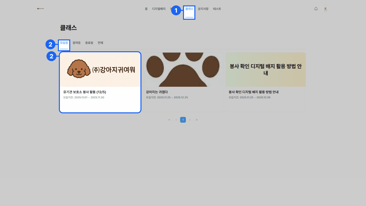 모집중인 클래스 리스트에서 참여하고 싶은 {클래스 카드}를 선택해 상세 페이지로 이동합니다.