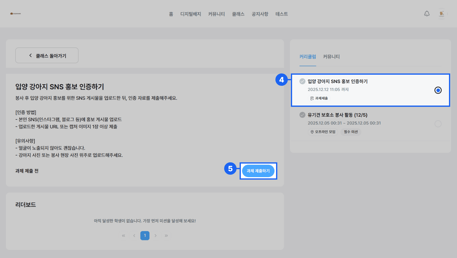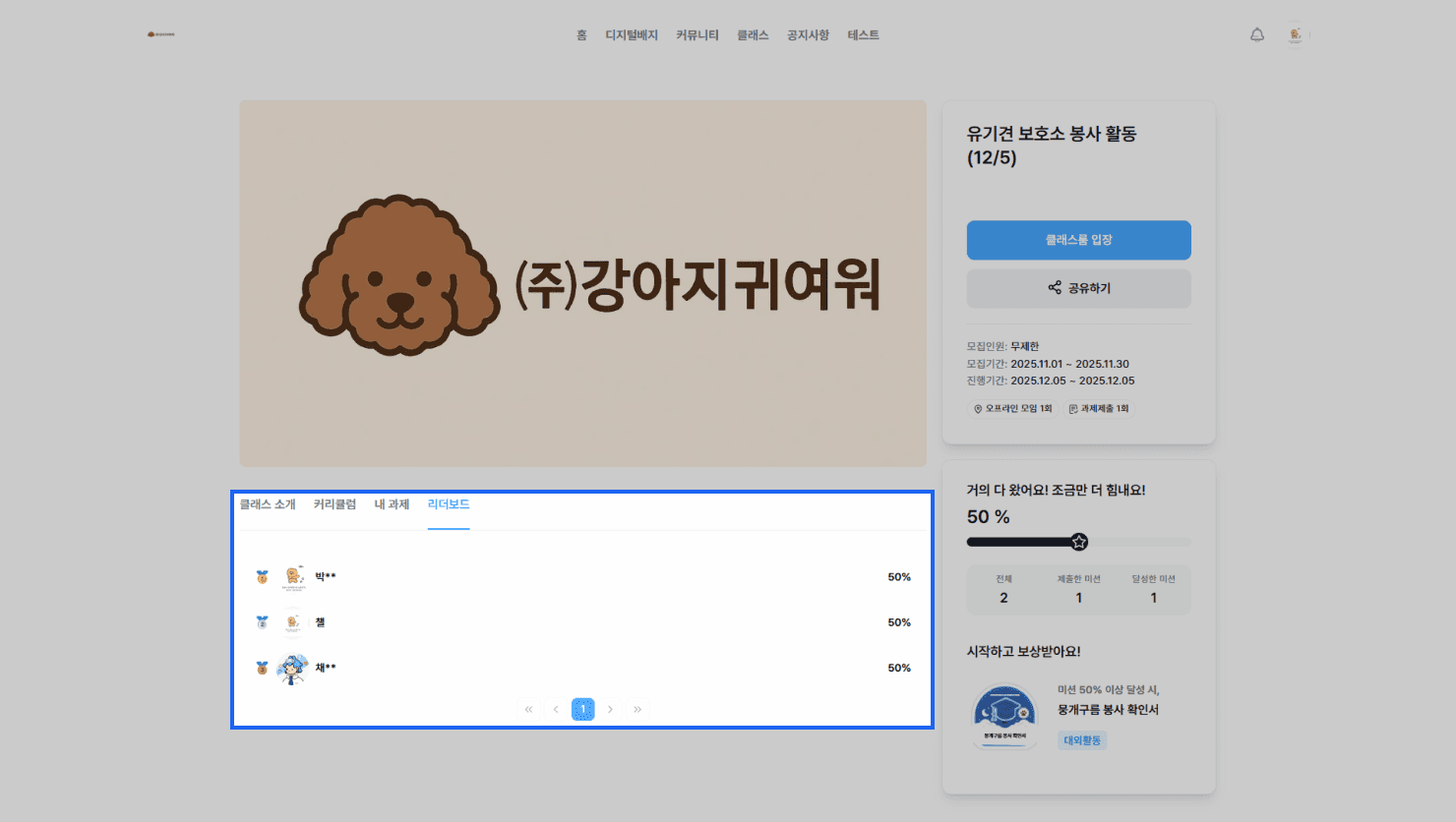 클래스 상세 페이지 상단 탭에서 [리더보드] 메뉴를 클릭합니다.