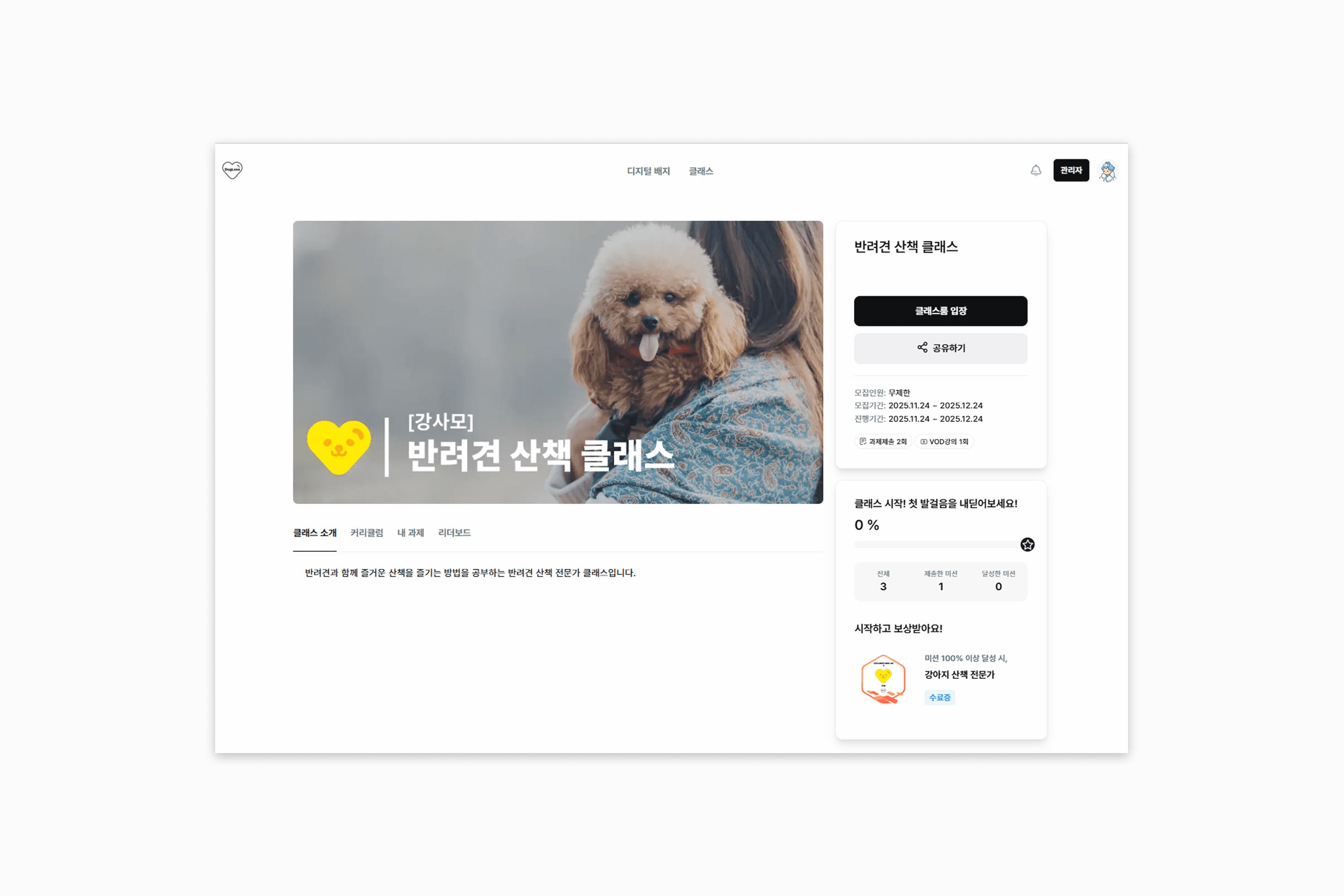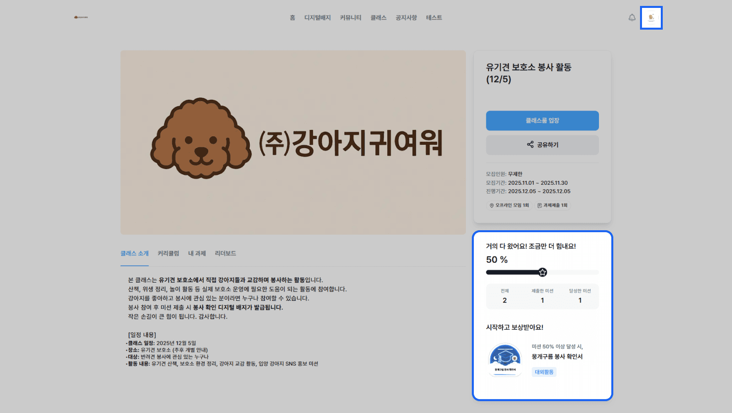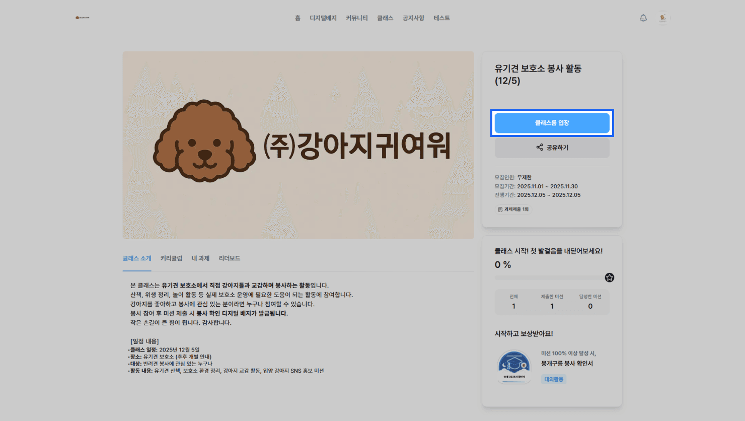 클래스에 등록된 미션의 보상 조건을 충족하면, 보상으로 등록된 배지를 발급 받을 수 있습니다.