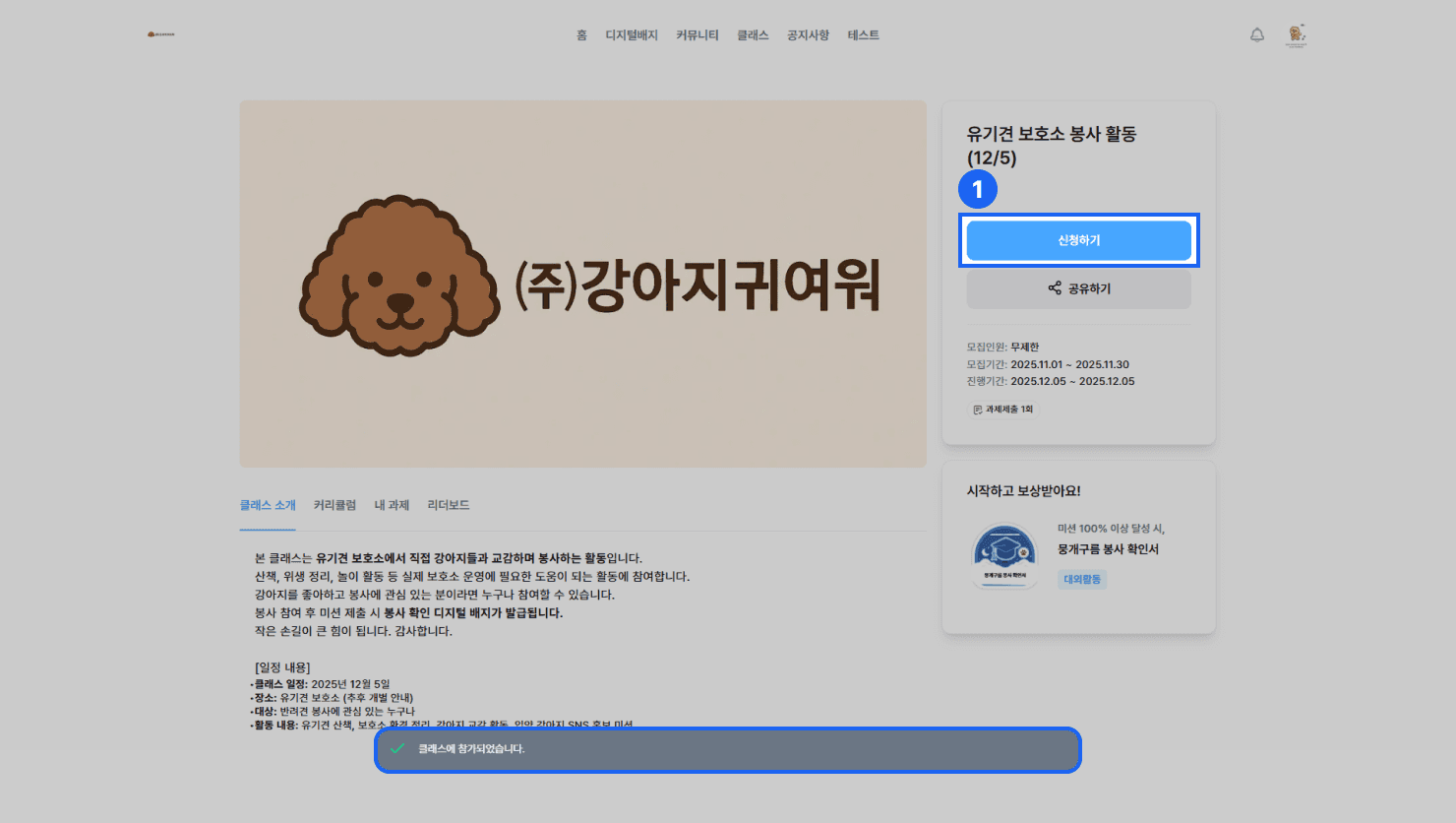상세 페이지 우측 상단의 {신청하기} 버튼을 클릭하여 클래스에 참가합니다.