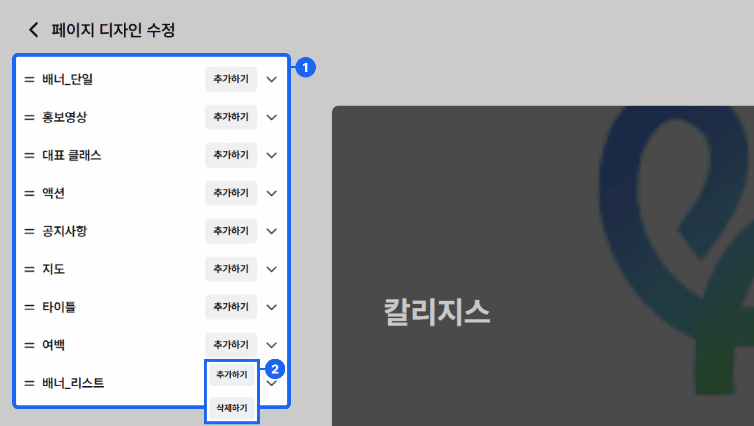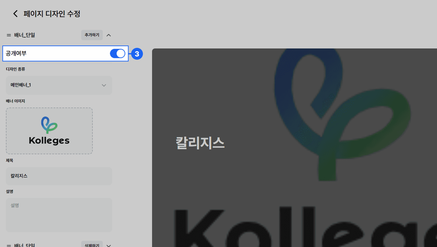 디자인 요소별로 오른쪽의 스위치 버튼을 클릭하여, 홈페이지 노출 여부를 설정할 수 있습니다.