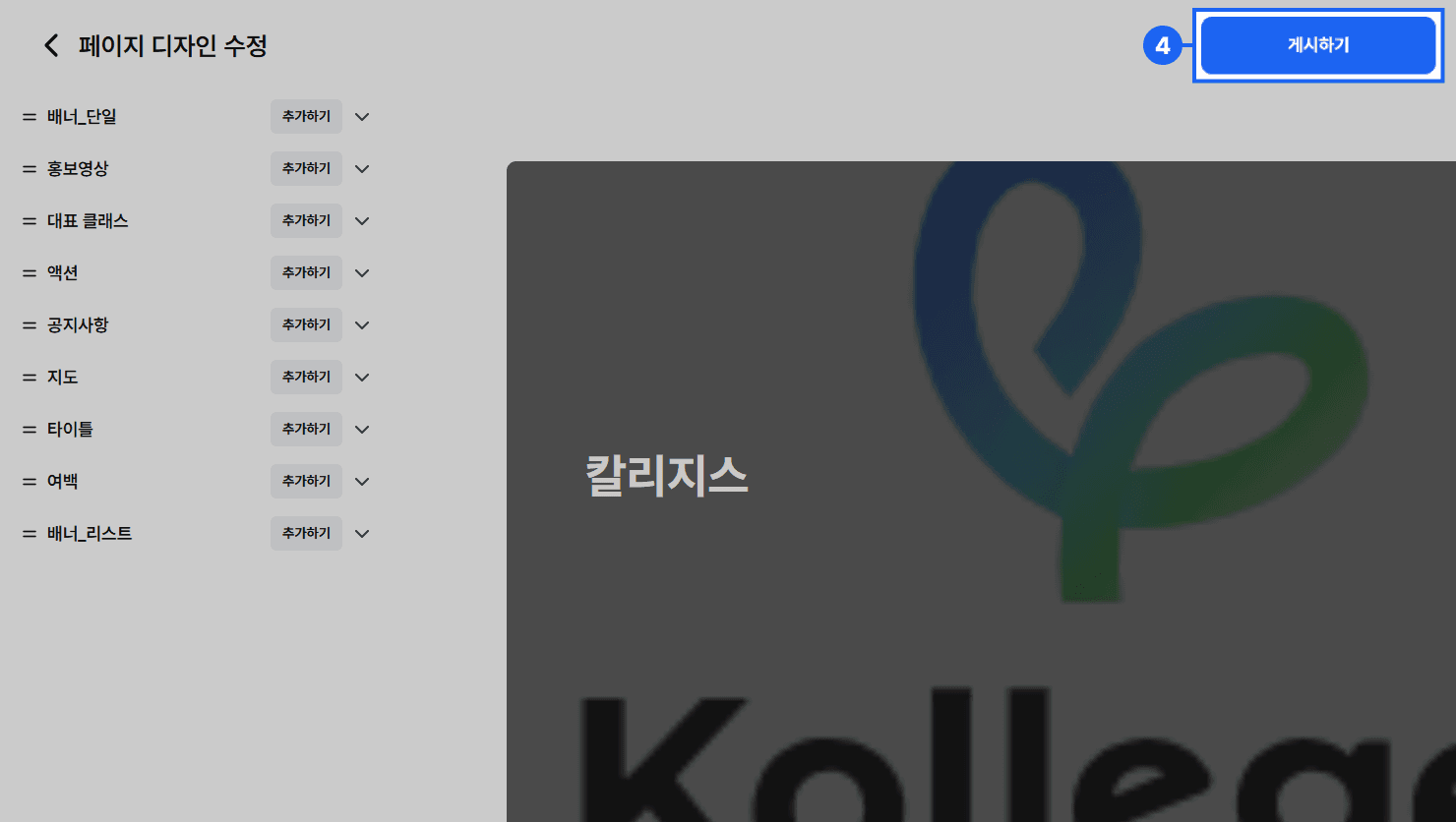 오른쪽 상단, {게시하기} 버튼을 클릭하면 편집한 내용이 홈페이지에 즉시 반영됩니다. (주의, {게시하기} 버튼을 클릭하지 않고 페이지를 나갈 경우, 수정 내용이 저장되지 않습니다.)