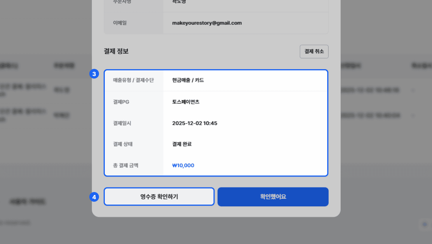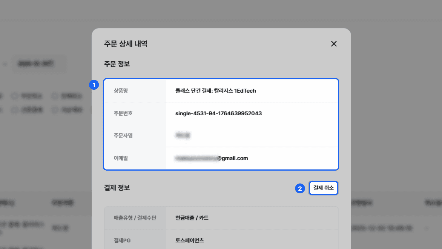 ② {결제 취소}: 클릭시 해당 주문의 결제를 취소합니다.
