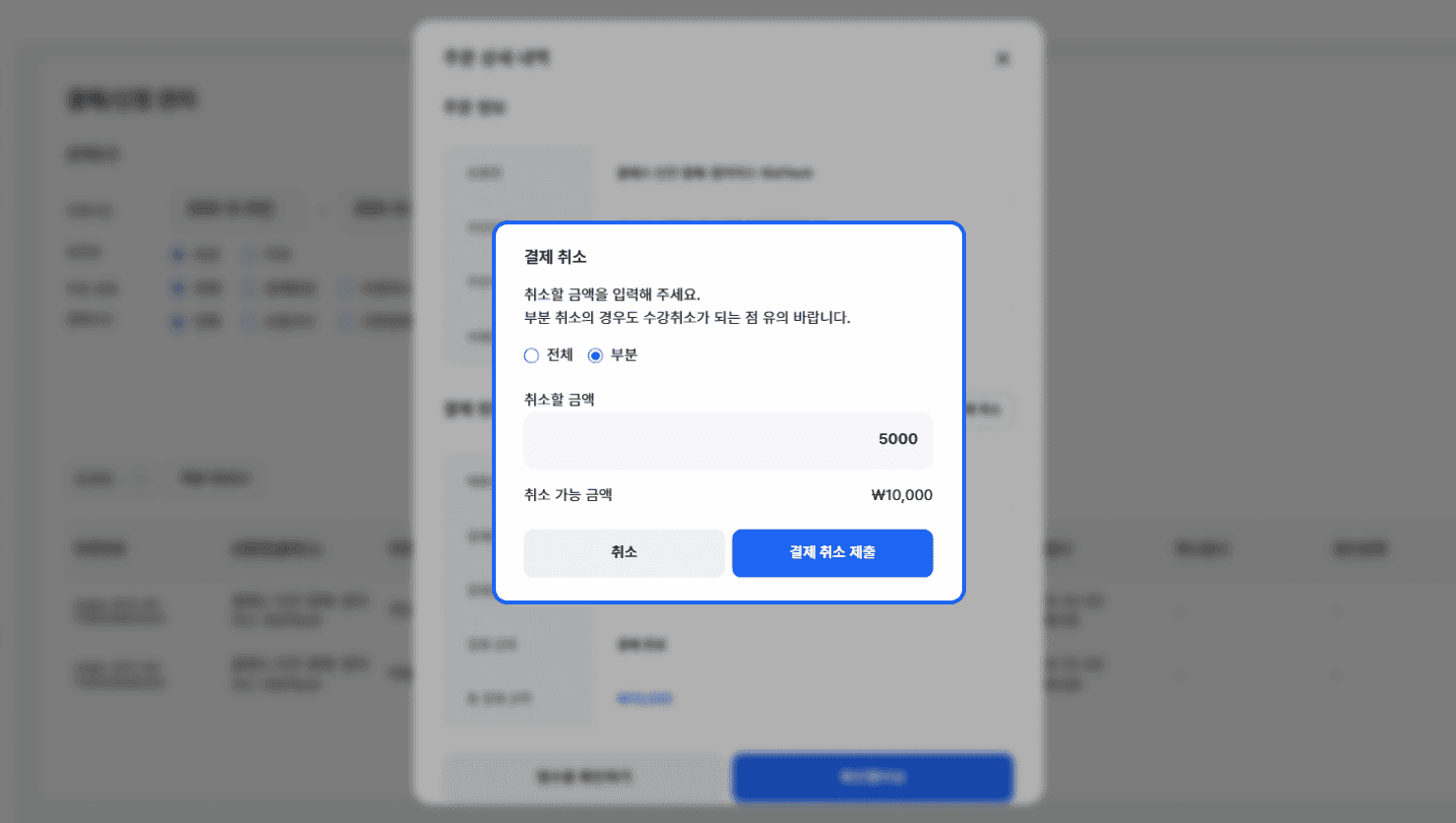 전체/부분 금액으로 결제를 취소할 수 있으며, 부분 금액 취소 시 취소할 금액 입력 후