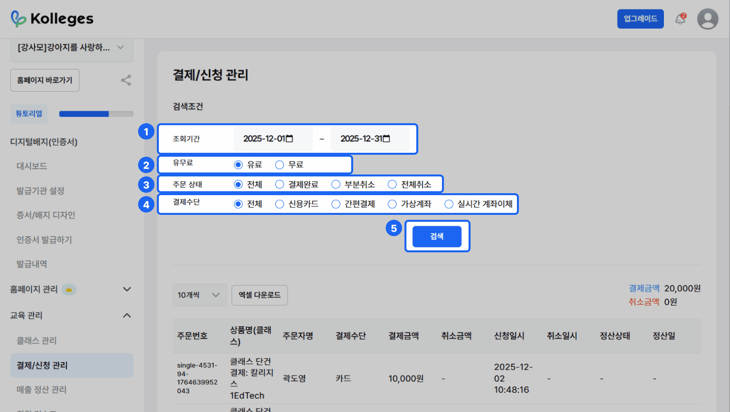 ⑤ {검색} : 버튼을 누르면 선택한 검색 조건에 따라 클래스 결제/신청 리스트를 조회합니다.